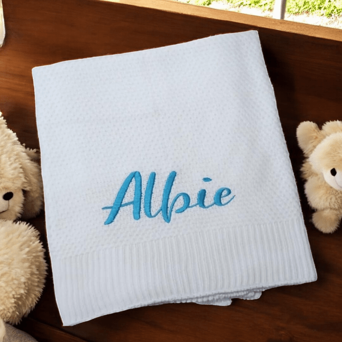 This Personalised Embroidered 100% cotton Knit Baby Blanket is the perfect gift for any baby shower.
